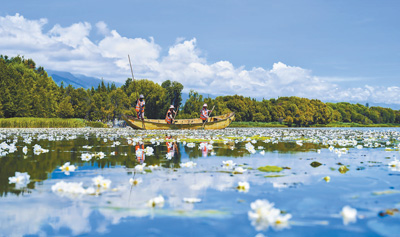 云南省大理白族自治州持续推进洱海水环境整治、水生态修复等工作,环湖生态环境逐步改善。图为环卫工人在海菜花盛开的洱海中进行湖面清洁。 杨文明 杨继培摄影报道