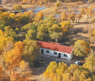内蒙古自治区额济纳胡杨林国家级自然保护区七道桥管护站,护林员的住所掩映在茂密的胡杨林中。 新华社记者 刘 磊摄