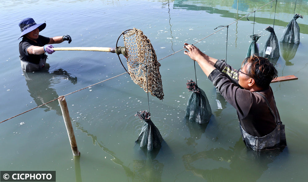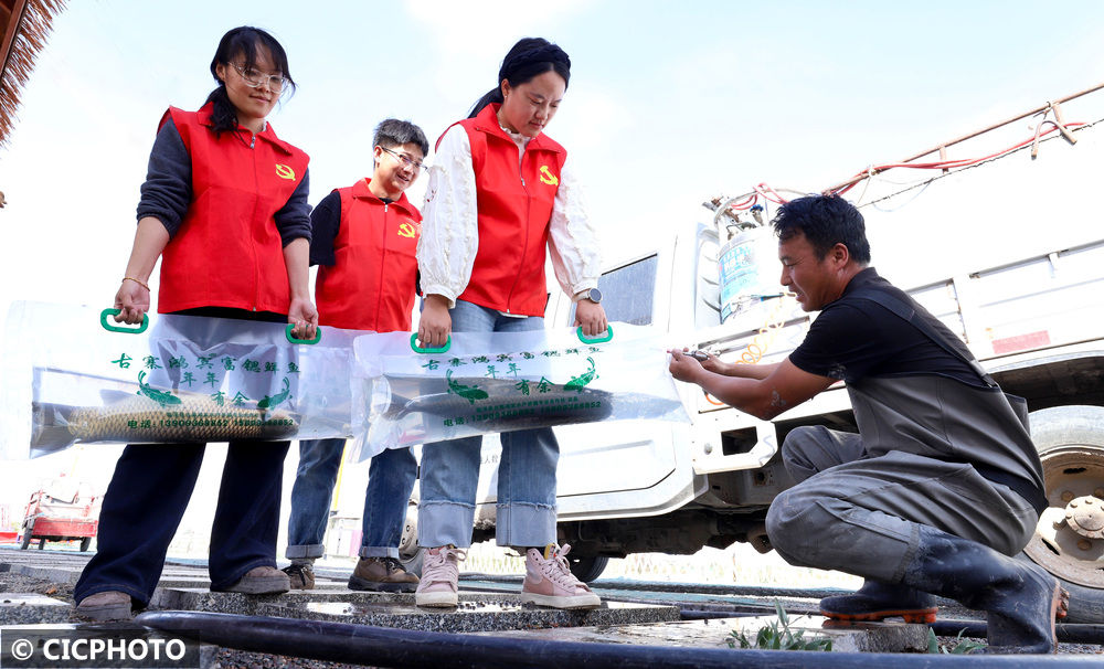 ↑2025年9月26日,在甘肃省张掖市临泽县鸭暖镇古寨村一水产养殖专业合作社鱼蟹养殖基地,党员志愿者同养殖户们一起为草鱼包装袋充气。CICPHOTO/王将 摄