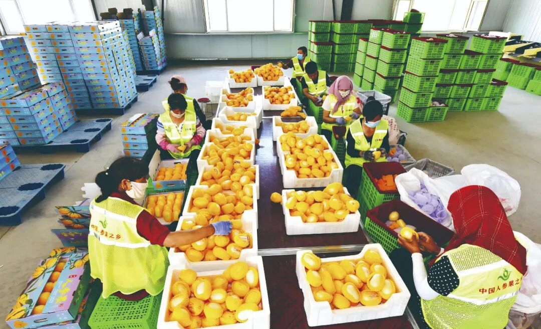 民勤县东坝镇东一村人参果分拣包装中心内,工人正在进行人参果分拣装箱。秦名顺/摄